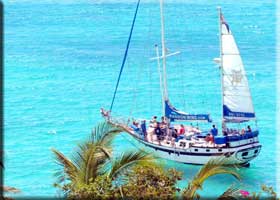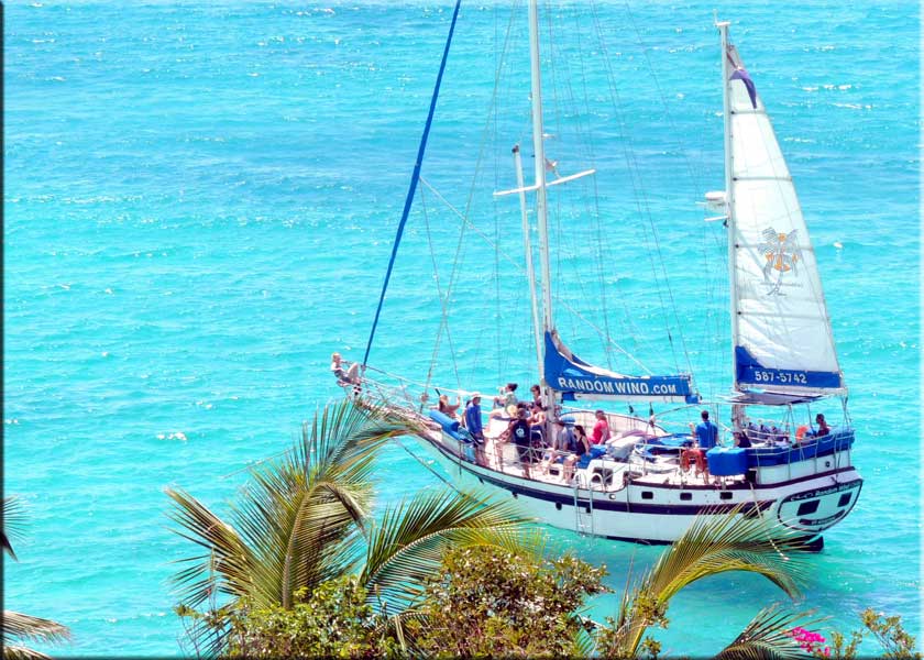SXM-Activities: Below left is Random Wind anchored off our Caribbean balcony on Tuesday. I believe they are having a snorkel and lunch. There used to be some pretty good snorkeling here, but the lack of a beach has kept most people away. That's Diane doing the acrobatics off the Tarzan swing.