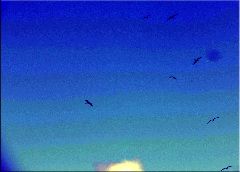 SXM-Beaches: Report from Wendy K, our Senior Cupecoy Correspondent: "As mentioned a last week, there were surfers on Saturday. A check on Sunday showed that the sand had moved from the NW to the SE, but there was very little dry sand anyplace. On Tuesday we got to the beach and there was a photo shoot taking place at baby beach, so we went in the water from middle beach, which now has lots of sand. (First time in two years I've been in there) The water was calm and clear today, and as we got closer to Shore Pointe, there were lots of pelicans diving into the water for fish. We commented that the air smelled a bit fishy, in fact. As we were just in front of Dany's bar, he called to us to look out to sea. There was a school of dolphin swimming by; one no more that 100 yards from us breached the water! Later, as we were leaving, we stopped to chat with Dany and John. They pointed out a dark area in the water that we had been swimming through. It was a large school of sardines that the pelicans were devouring. [ed note: I actually took the photo on the right from my balcony as some frigate birds were feeding on the sardines.] Saturday was not as nice as the last two days. The sand was shifting back towards Shore Pointe, and Ocean Club, but was mostly moist. Baby beach and middle beaches had some dry sand. The waves were a little stronger than Friday."