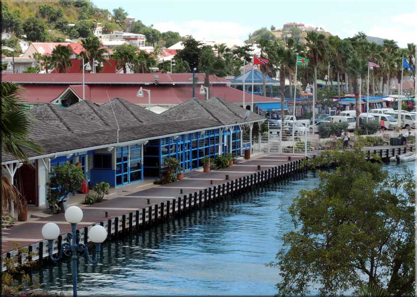 Shopping: After a lunch at Oizeau Rare we walked next door to the West Indies Mall. It's still beautiful and almost fully occupied, at least the first two floors. The third floor is largely empty. It's unclear what is happening with Le Fourmi. There is a restaurant up there but they are not using the lovely (now a bit decrepit) terrace overlooking the harbor that Fourmi used to use. On the right is a photo from the now defunct terrace looking down to the Anguilla ferry dock/immigration building.