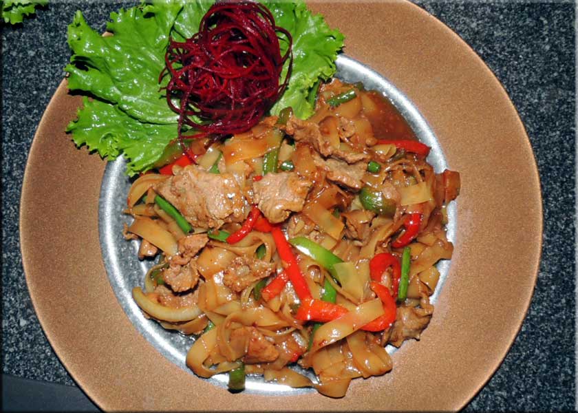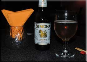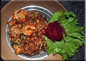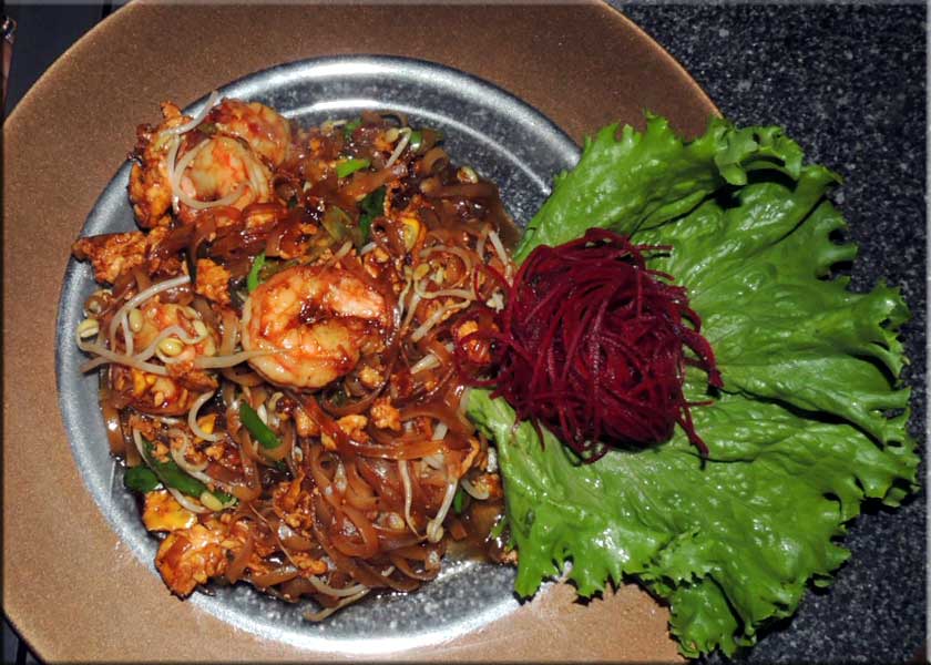 We ordered a couple Singha beers ($5 each, below lelft), the beer of Thailand, and looked over the menu. We started with a Moo Tod Samun Pri, crispy pork with Thai herbs in and a spicy sauce ($9). It was so good that the photographer finished it without taking a photo. Martha had the Pad Thai with shrimp ($21, below center) and I had Pad Kee Mao Nuea with beef ($17, below right). Basically, there are several preparations of various noodles, curry, and fried rice to which you can add some protein. Tofu is cheapest, Beef, chicken and pork are come next, followed by shrimp, then a seafood mix, and finally poo. Luckily, that means crab in Thai. Not all of these are available with every base, but everything is available Mild, Medium, Hot, or Thai Spicy. We went with Hot. That required another round of Singhas. The main courses were were both very good. The total came to about $72 and they added a 15% tip to get to $82. Martha even brought home a bit, making this one of our least expensive dinners this season. Obviously, four beers at $20 is way below most of the wines we buy. They did have an interesting wine list, but we really prefer beer with very hot food.