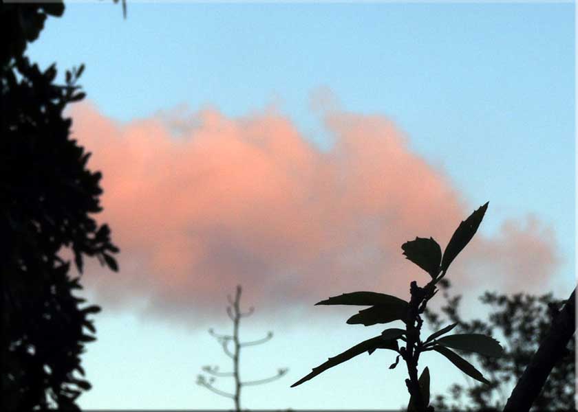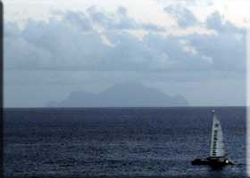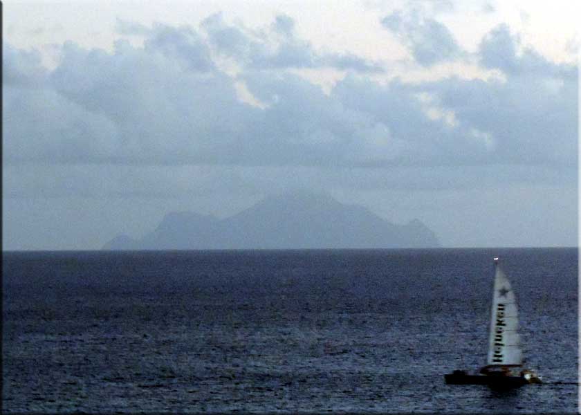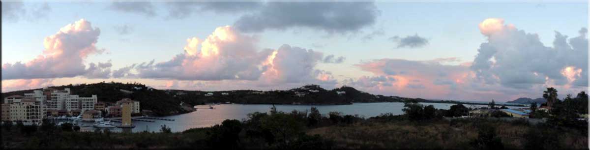 | Weather: Last Sunday was great, somewhat breezy, but warm and clear, with the sunset lighting up clouds above Saba (right). The sunset pano below was stitched together from three shots taken from my lagoon balcony on the same evening. The waxing crescent moon rose with Venus at its side as we headed out to dinner that evening. The pano of the lagoon and causeway below was taken on a beautiful Monday coming over the Cakehouse shortcut from Pburg to Cole Bay. We were on our way to the Grand Marché and on into Marigot for a nice lunch at Oizeau Rare. Tuesday and Wednesday were spectacular. The photo of the cruise ship and Saba was taken on Wednesday morning. In the grocery section there are some sunset photos on Wednesday evening. Thursday was another fine day but Friday began with light showers and more than enough clouds. Saturday had more showers in the morning which included a lovely rainbow during my morning swim but fewer clouds. It turned into a lovely, but breezy, day. Sunday is starting cloudy and hazy.