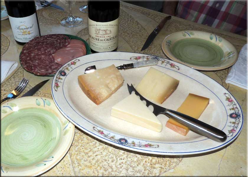 They have a special at lunch, offering an ap and a plate for 15€. There are a few choices and I went with the calamari on a bed of puréed celery (below center) followed by ribs (far below center). Martha surprised all of us by ordering a cheeseburger (far below left, 14€)?!? I got her a full flavored 2010 Crozes-Hermitage (below left, 30€). Her cheeseburger was pretty authentic complete with orange cheese, a color hardly found in nature, but it brings back memories of Velveeta. The burger was very good, cooked medium rare as requested and even the orange cheese was ok, possibly mimolette, the favorite cheese of General Charles de Gaulle. As Jenkins says in his Cheese Primer, "Perhaps the General ate too much army food." My ribs were nothing like the slobbery, sweet-fest of American ribs. They arrived quite dry with a small amount of drippings. I thought they were quite good. Both plates had crisp, tasty fries. All in all, a nice lunch in a lovely spot with water cascading down the hillside and a view out to the harbor. The total was 64€, half food, half wine and water.