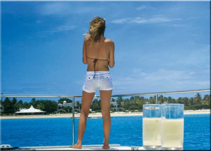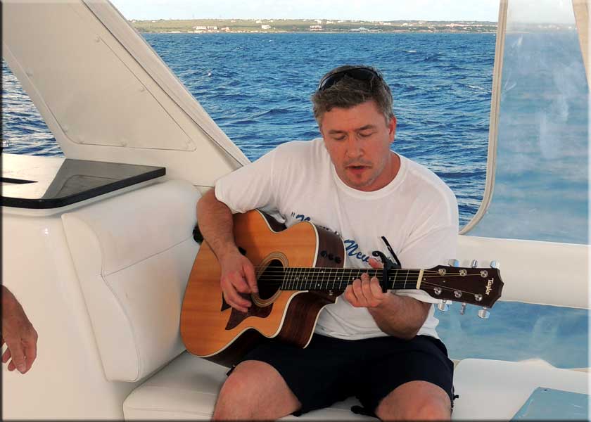 | Funseaker has snorkels, goggles, and stand-up paddleboards, snacks and drinks as we sailed. Our lunch was included in the price. It's a nice touch if you are a picky eater, or allergic, you have the entire menu available and a land based chef who can more easily make menu modifications. It also leaves the crew more attentive to your drinking requirements! The far right photo is half of Now or Never. He graciously performed several songs for us as we battled some chop heading home. |