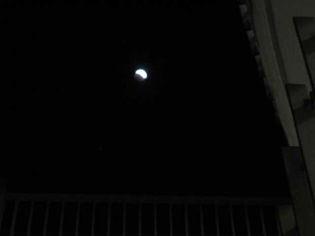 The photos below are from the eclipse of the full moon that occured about 10:30 PM here. The first is a shot from our lagoonside balcony. You can see part of Sapphire's structure, so we went down to the road and took the next two shots. It never got as dramatic as I expected, never turned orange, and even with binoculars, the planets on either side of the moon were not very impressive. Betty at the Horny Toad Guesthouse said that later it was somewhat orange and the paper showed a time lapse sequence that had a bit of color. Thursday had some serious rain but Friday was quite nice. Saturday was a bit cloudy, hazy, and cool - but no rain.