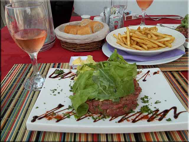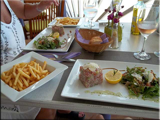 Wendy K reports: We both had a special ap of tuna tartare and added some frites. The Chateau des Vingtinieres rose was 22€. The food was wonderful and even though it had a a more limited and a bit more expensive menu than Rainbow, we think we'd return here for the food. (ed note: sometimes you do get what you pay for and the chef/owner, Hervé Sageot, was a two time winner of the taste of St Martin award.) As you can see from the pics, the beach area isn't as developed, and the restaurant interior didn't look much different from when it was La Marine. Hervé was talking to someone and appeared to be discussing some changes. The service was very friendly and efficient.