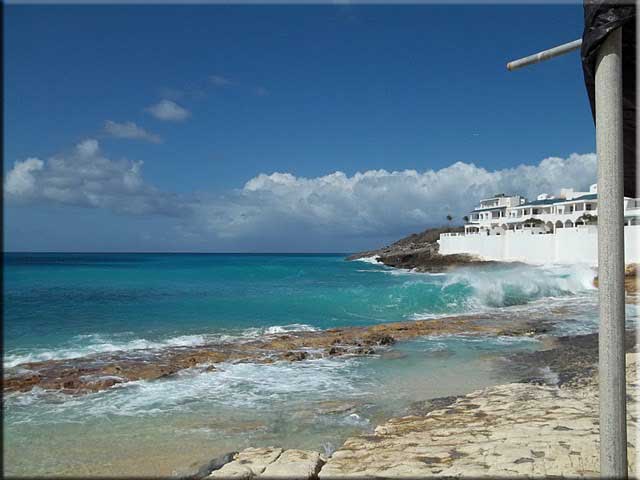 Weather: Mid January weather was quite comfortable reaching the low 80s with occasional showers and a nice breeze. It has stayed that way for most of the month and the forecast for the coming week says it will range from 75 to 80 almost every day with a 20-30% chance of showers. In short, perfect weather for a beach vacation. On the left is a shot of Cupecoy taken from the southern edge of Shore Pointe looking to the south.