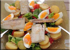 Groceries: On the left is a variation on a salade Niçoise using mahi rather than tuna. We got a package of frozen mahi at Super U and had a mahi dinner one night and this salad a couple days later. On the right is the refurbished Sarafina's Bakery. We still believe their finettes are the best bread on the island. We buy several and freeze them, reconstituting them in a toaster oven as needed.