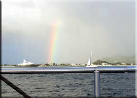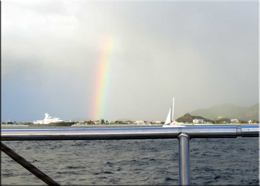 On Thursday we went out on Lambada's sunset cruise. It was a pretty nice day, but it poured as we headed to the Simpson Bay Resort to board. As usual, it only rained for about 10 minutes but it stayed pretty cloudy. Some clouds in the distance continued raining, producing a complete rainbow off our stern as we headed west. Part of a second rainbow formed above the original one. The sunset wasn't so great as there were thick clouds on the horizon, but we did get the tiniest bit of green flash as the last bit of sun dropped behind the dense clouds.