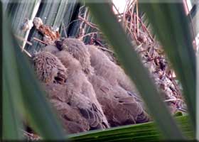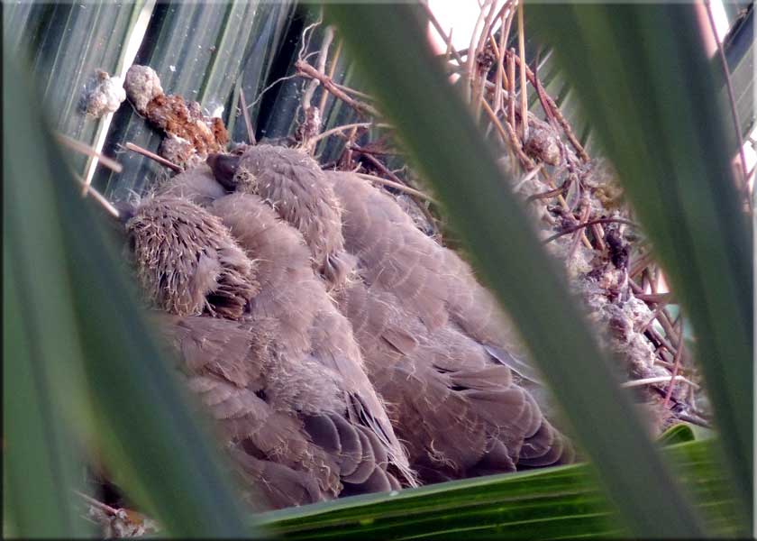 Nature: On the right are the two new chicks from our dove. The palm tree is pretty healthy this year because of the recent rains.