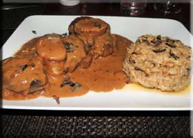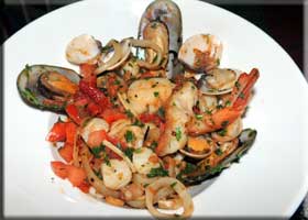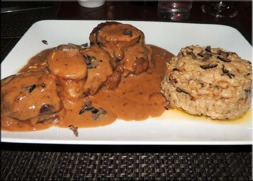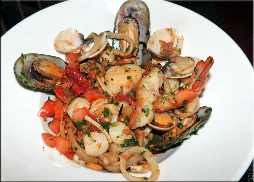 We discussed the sautéed Italian sausage with peppers and onions in tomato sauce with baked maozzarella cheese ($13). This dish contains everything I like about Italian cuisine: a tomato sauce with peppers and onions with mozzarella and some tasty sausage. We decided to order two main courses as Martha thought I'd have to finish most of hers. She had the Linguini Di Napoli (below right, $25), shrimp, calamari, scallops, mussels, and assorted seafood in fresh basil tomato sauce over linguini pasta. She was offered spicy sauce, which she accepted without question. I had a special: a variation on osso buco, a long cooked, very tender veal shank, but with a truffle and cream based sauce accompanied by truffle risotto. It was amazing at a mere $30, because Pascal says he has friends in the truffle business. We ended with another glass of wine for Martha and an old rum for me. Total cost, about $105 as they are still doing 1 to 1 for cash purchases. Since that isn't as great as it used to be, they are now comping the parking! There is no water view, but this is one of the best deals in Grand Case, good food, nice wines, with friendly service in a nice spot.