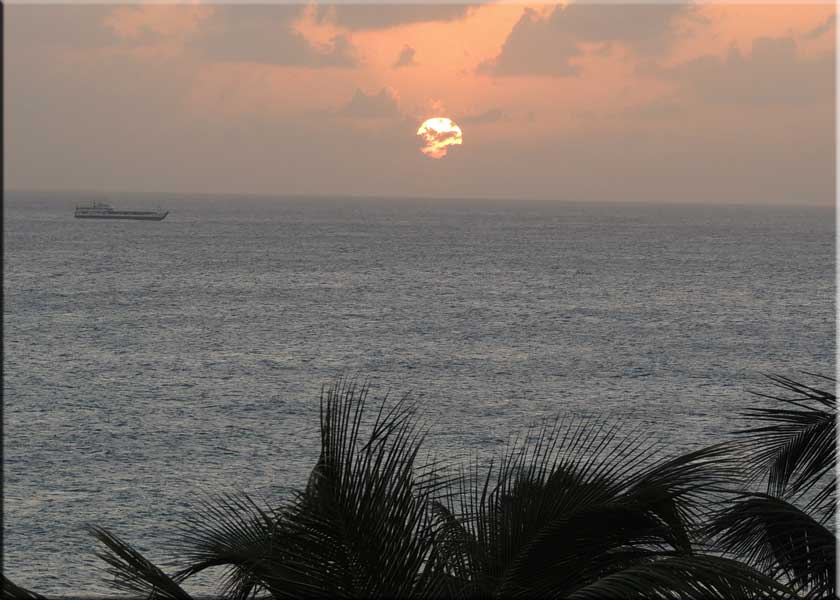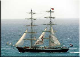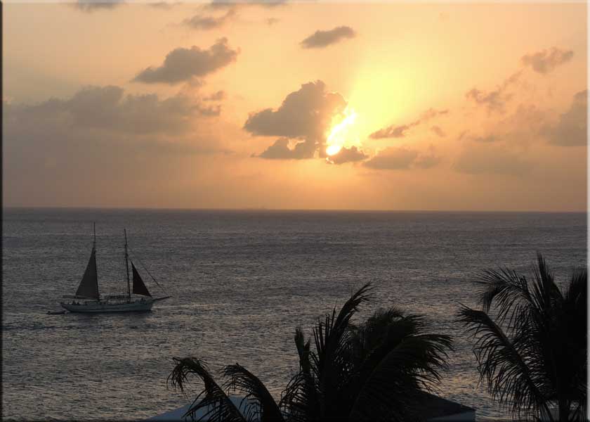 But things seem to be getting better. We have an elevator, the swimming pool works, and Martha uses the gym daily. The TV is hopeless, but nothing spoils the spectacular views from our unit. Below is the view from our lagoon side balcony over the lagoon to the ruins of La Belle Créole, damaged in 1995 by Hurricane Luis and never repaired. Some places have even less maintenance than Sapphire! In the very far distance on the left is Anguilla. Above on the right is a photo taken from our Caribbean side balcony of Mercedes, a square-rigger. She's motoring with limited sails up because last Sunday was quite blustery.