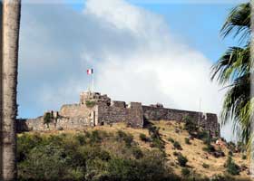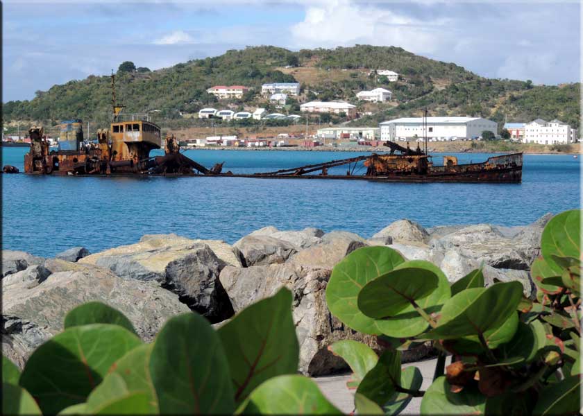 Last Sunday turned out to be quite cloudy by the end of the day. Monday and Tuesday were pretty hazy in the morning, but cleared out. Monday produced the sunset pano below, taken from Sapphire's pool area during the Manager's Party. It ended in a green flash. Early in the week Passat came by on their sunset cruise (right). Below left is a wreck from 1995's Hurricane Luis rusting peacefully in the Bay of Potence on the north side of Marigot. In the center is Fort Louis on the hill above Marigot harbor. Note the fairly blue sky, but also clouds. These were taken on our way to a sunset cruise on Lambada on Thursday. Shortly after these shots, a downpour soaked us thoroughly as we walked from our parked car a few feet to Select Wine. The photo below right shows yet another cloudy sunset. It has been hazy and cloudy with more rain than usual and looks as if it will stay that way.